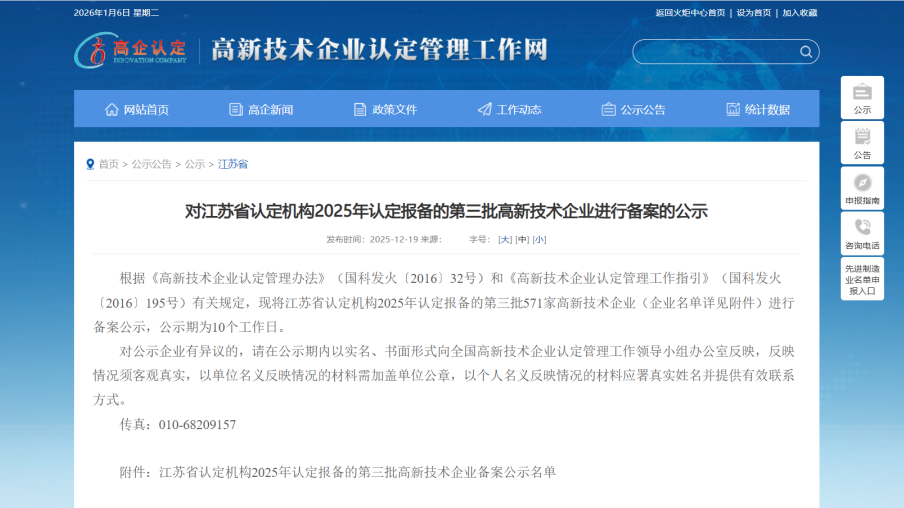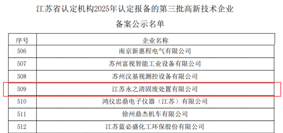 近日,全国高新技术企业认定管理工作领导小组办公室发布《对江苏省认定机构2025年认定报备的第三批高新技术企业进行备案的公示》。永清环保旗下全资子公司——江苏永之清固废处置有限公司(以下简称“江苏永之清”)凭借扎实的技术实力,顺利通过复审,再次荣获“国家高新技术企业”认定,这标志着公司在技术创新与可持续发展方面持续获得国家层面的权威认可。